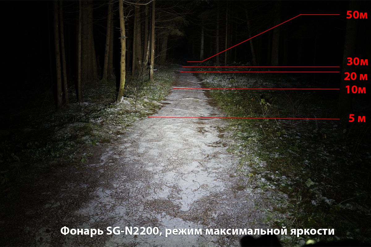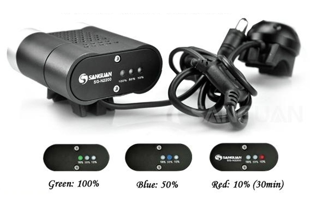 Фонарь SANGUAN SG-N2200 образует мощное равномерное освещение на расстоянии до 50 метров. Стоит отметить полное отсутствие световых границ между зонами освещения, что очень комфортно для глаз. 2 светодиода работают от выносного блока аккумуляторов (6600mAh, 7,4V) который можно заряжать от сети 220В, с помощью зарядного устройства. Сила светового потока 2200лм. 4 режима работы: 100%, 70%, 40%, 10%. Класс влагозащиты IP66. Выносная кнопка может быть размещена в наиболее удобном месте руля, длина провода кнопки около 30см. Индикатор заряда имеет три светодиода и сообщает об уровне заряда аккумулятора на уровне 100%(зелёный), 50%(синий), 10%(красный). Заряда аккумулятора 10% хватает примерно на 30 минут работы. Фонарь может быть закреплён на руль велосипеда (резиновыми хомутами), на голову велосипедиста или на шлем, с помощью налобного крепления.